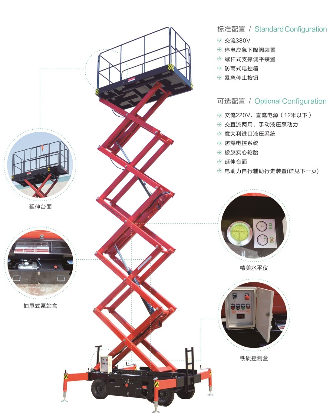采用寬截面錳鋼矩形管,運行更加平穩(wěn)、可靠點動控制升降,平臺上下雙向控制升降控制電壓為直流24V,保證操作人員的安全帶有應(yīng)急下降裝置,在突然斷電時,可安全下降電氣控制系統(tǒng)設(shè)有雙接觸器、雙限位開關(guān),底盤設(shè)置可外拉式活動抽屜,檢修方便,底盤設(shè)置標(biāo)準(zhǔn)運輸叉車孔