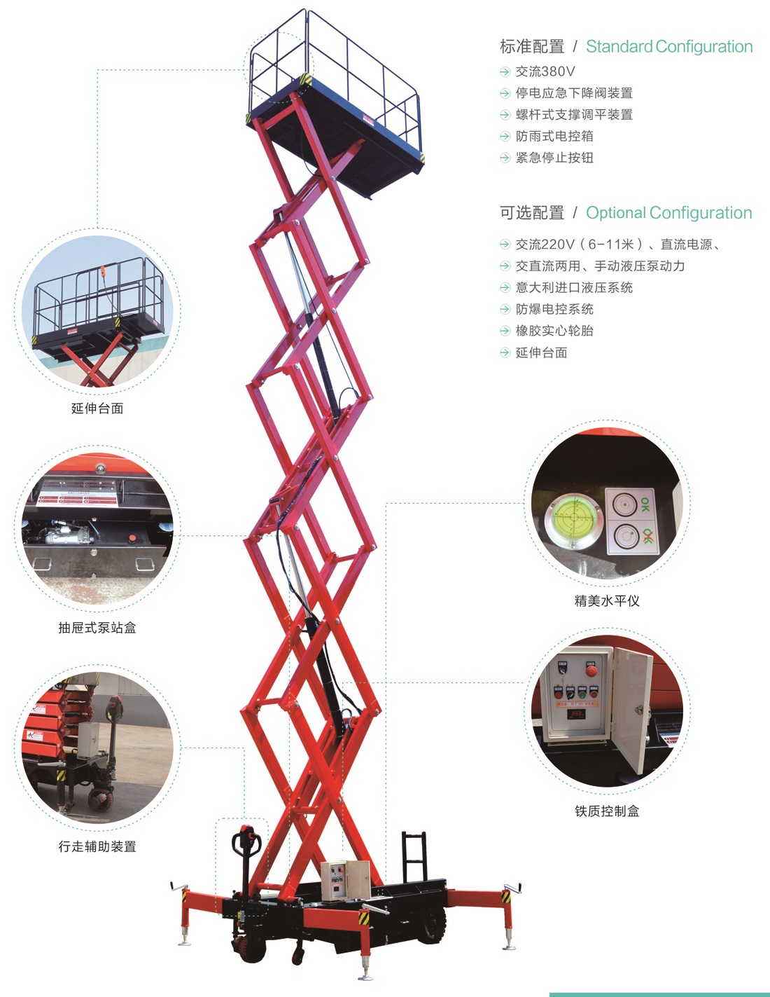 采用寬截面錳鋼矩形管,運(yùn)行更加平穩(wěn)、可靠點(diǎn)動(dòng)控制升降,平臺(tái)上下雙向控制升降控制電壓為直流24V,保證操作人員的安全帶有應(yīng)急下降裝置,在突然斷電時(shí),可安全下降電氣控制系統(tǒng)設(shè)有雙接觸器、雙限位開(kāi)關(guān),底盤(pán)設(shè)置可外拉式活動(dòng)抽屜,檢修方便,底盤(pán)設(shè)置標(biāo)準(zhǔn)運(yùn)輸叉車(chē)孔帶有輔助行走裝置,移動(dòng)輕便。