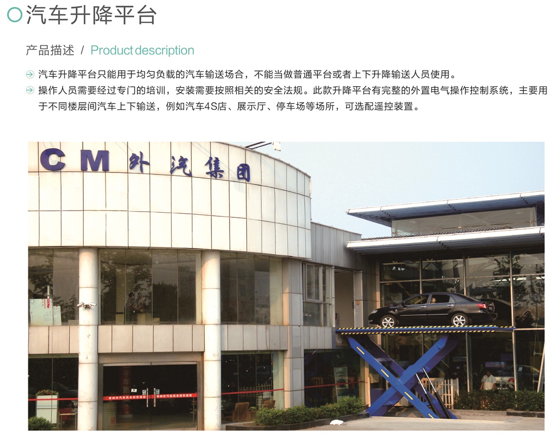 汽車升降平臺只能用于均勻負載的汽車輸送場合,不能當做普通平臺或者上下升降輸送人員使用。